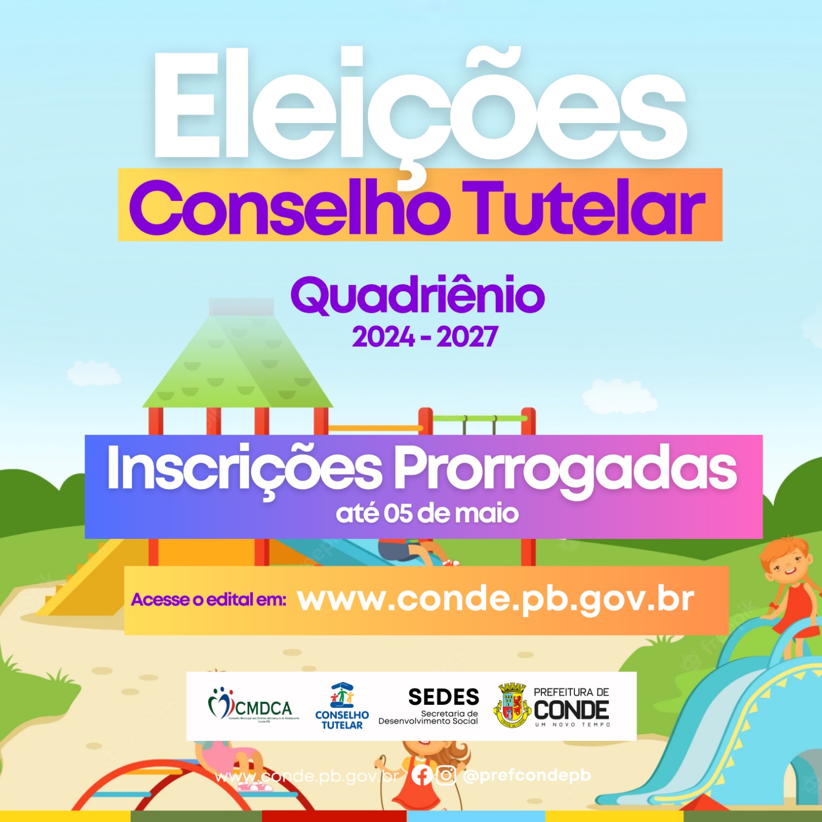 para o Processo Eleitoral de escolha dos membros do Conselho Tutelar para o quadriênio 2024 – 2027, foram prorrogadas até o dia 05 de maio. A prorrogação atende a um pedido da Promotoria do MPPB e foi publicada na edição do diário oficial desta sexta-feira (28). As eleições unificadas em todo o país estão previstas para o dia 01 de outubro do ano vigente.
