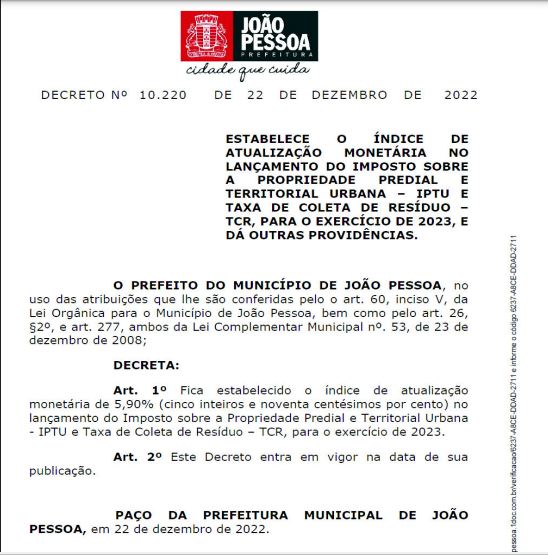 O prefeito de João Pessoa, Cícero Lucena (PP), assinou o reajuste de 5,9% para o Imposto Predial e Territorial Urbano (IPTU) da Capital em 2023. A atualização do valor consta em decreto no Diário Oficial do Município desta terça-feira (27).