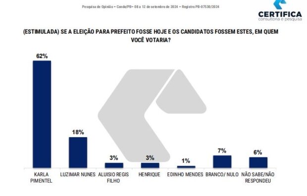 Pesquisa estimulada realizada pelo Instituto Certifica em parceria com o Portal do Litoral/PB, divulgada nesta sexta-feira (13), revela que Karla Pimentel é a favorita na corrida eleitoral para a prefeitura de Conde. Com 62% das intenções de voto, quase três vezes mais que o percentual alcançado pelo segundo colocado, Pimentel lidera com uma vantagem expressiva sobre seus concorrentes.