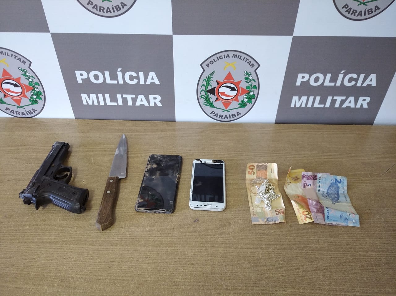 A Polícia Militar prendeu um suspeito e apreendeu um adolescente que tentaram assaltar um motorista de aplicativo no bairro do Colinas do Sul, na zona sul de João Pessoa. A ação da PM, na manhã desse domingo (13), ainda resultou na apreensão de uma faca peixeira e um simulacro de pistola que estavam com a dupla.